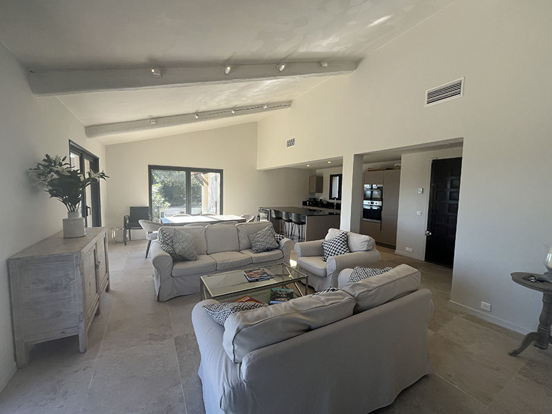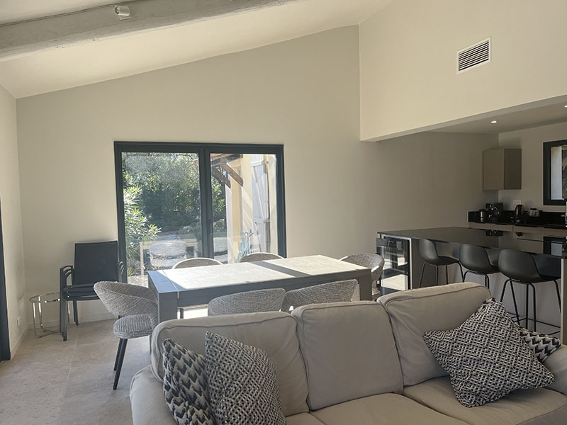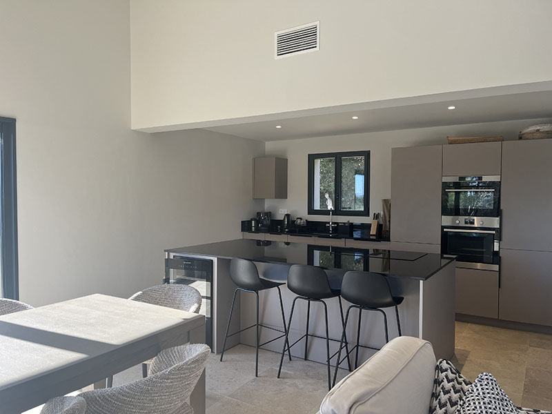 Designed for relaxation and socializing, the open-plan living area includes a comfortable sitting space and a dining area that showcases stunning views of the Maures hills. The kitchen is a culinary delight, fully equipped with a large fridge, dishwasher, induction hob, double oven, microwave, filtered water tap, and a wine fridge.