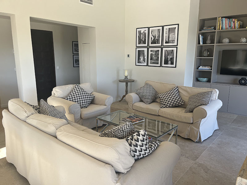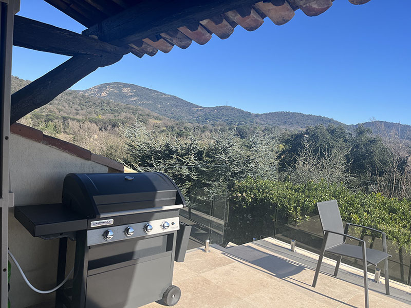 Step outside to the front terrace, where you’ll find a seating area with a dining table and BBQ, perfect for alfresco meals, alongside a cozy lounge area ideal for sipping evening drinks while glimpsing St. Tropez in the distance.